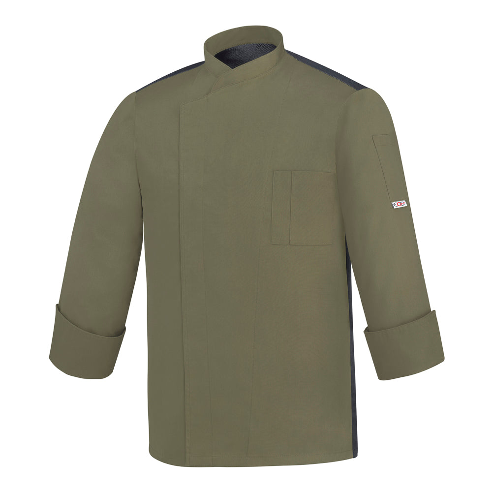 Die Ottavio ML Kochjacke in elegantem Olivgrün vereint italienisches Design mit höchster Funktionalität. Hergestellt aus atmungsaktiven Materialien, die eine optimale Luftzirkulation garantieren – ideal für lange Schichten ohne Kompromisse bei Komfort und Stil.